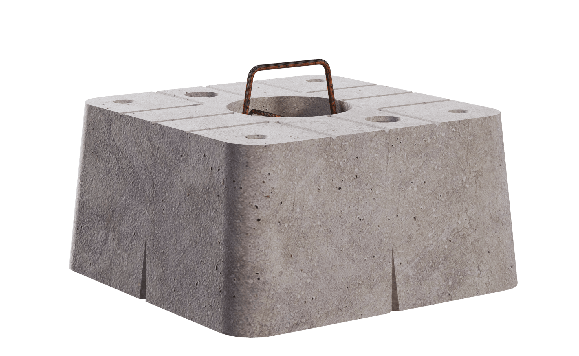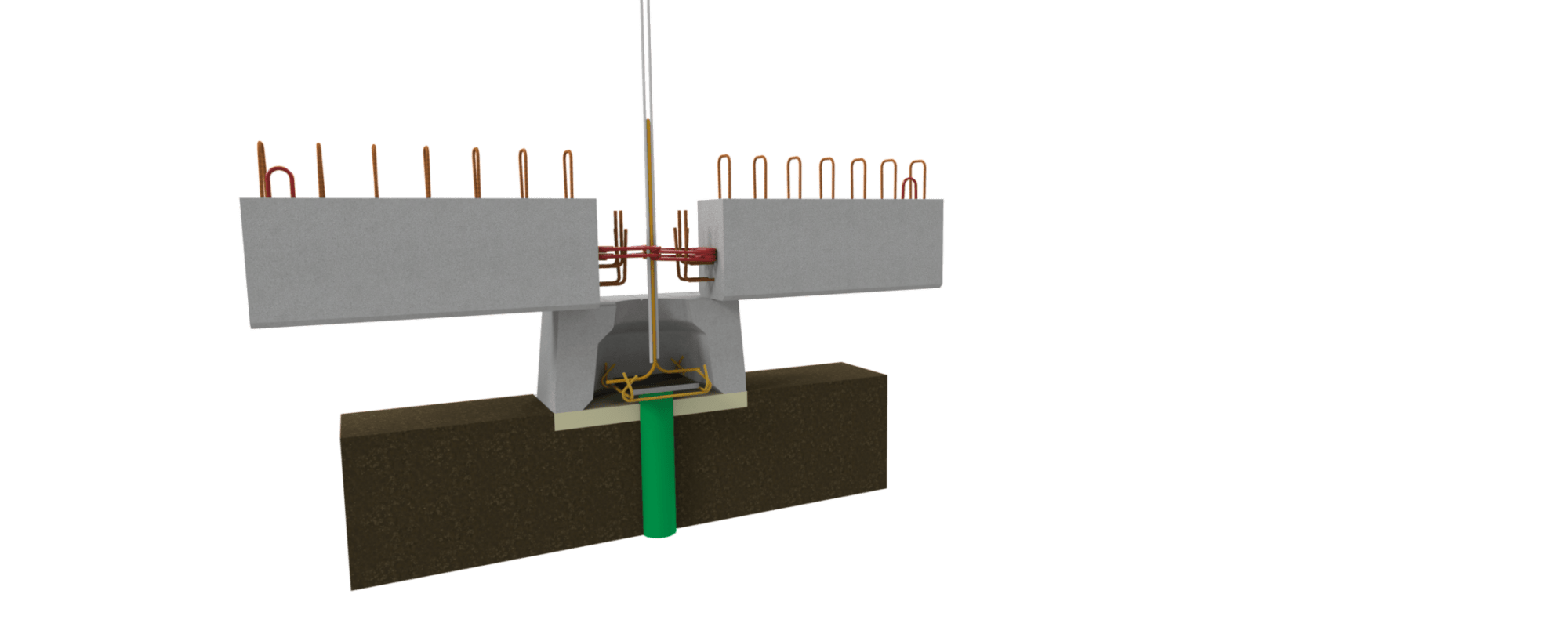 Le plot pieu est composé d’une cage d’armatures renforcée de diamètre 10 spécifiquement conçue et dimensionnée pour s’encastrer au dessus de la platine du pieu, ainsi qu’un kit acier intégré au plot.